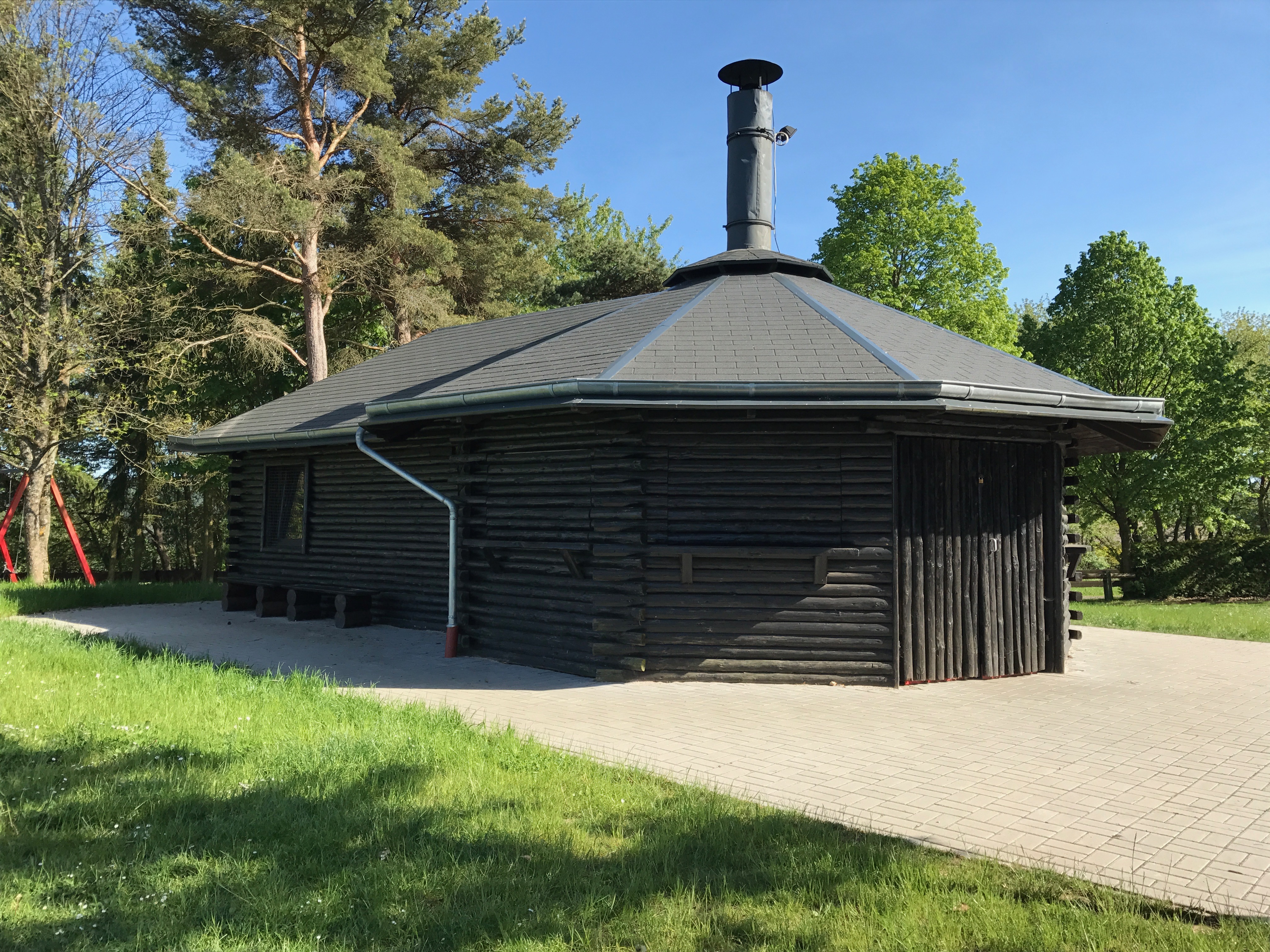 Das Gebäude wurde in Holzbauweise erbaut und verfügt über einen großzügigen Innenraum. Im vorderen, rund gestalteten Bereich befindet sich eine große Grillstelle. Rund um die Grillstelle sind entlang den Wänden Sitzbänke fest angebracht, welche durch Tische und Holzbänke ergänzt wurden.